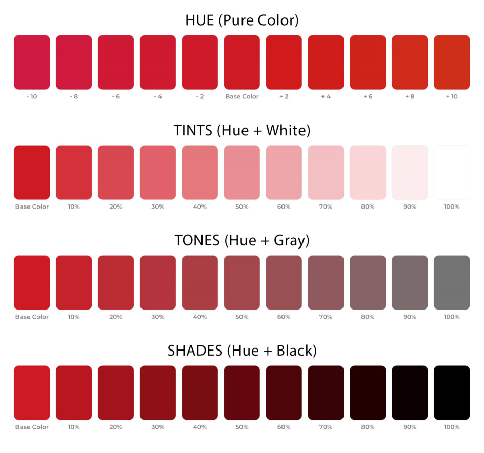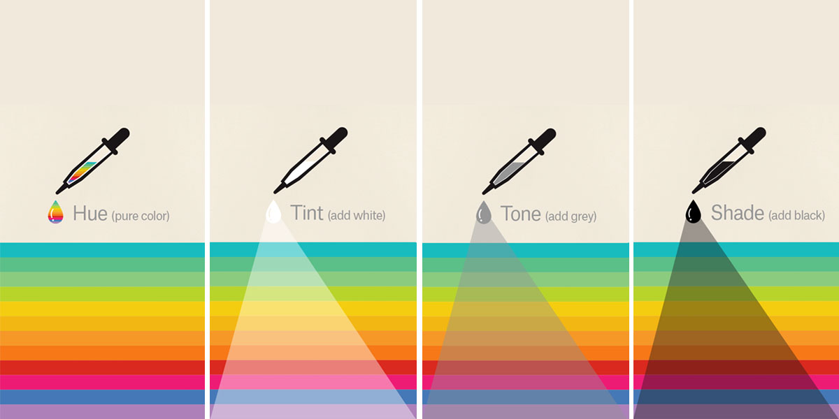 You may recognize the term “shade” because it’s used quite often to refer to light and dark versions of the same hue. But actually, a shade is technically the color that you get when you add black to any given hue. The various “shades” just refer to how much black you’re adding.
